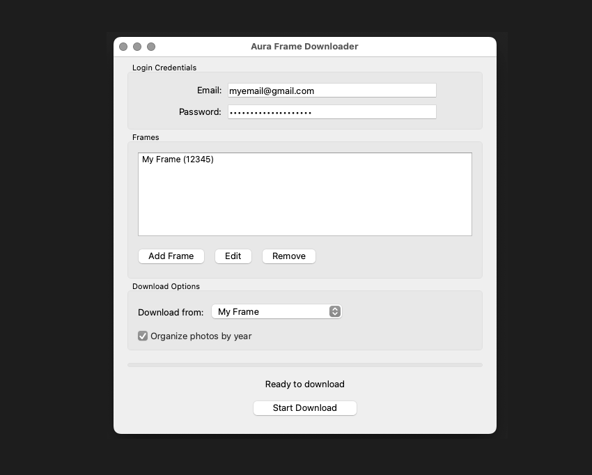 Aura Frame Downloader is a tool to bulk download all the photos from Aura digital picture frames. Aura provides no easy way to do this so I created this tool to solve the problem.