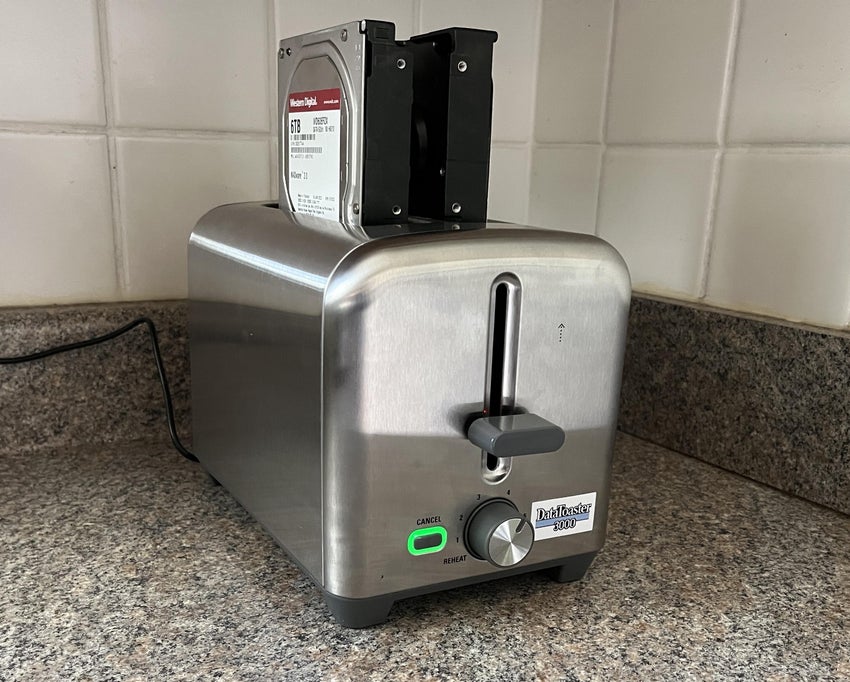 September 2024The DataToaster 3000 is a fully functional NAS with two 3.5 inch hard disk docking stations built inside of a toaster. The hard disks can be easily swapped out (while it’s powered off) without taking anything apart. It uses a Zimaboard x86-64 single board computer that can run many different operating systems.